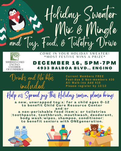 Join the Sherman Oaks Encino Chamber of Commerce as we celebrate the holidays! See old friends and make new ones. Drinks and lite bites provided.