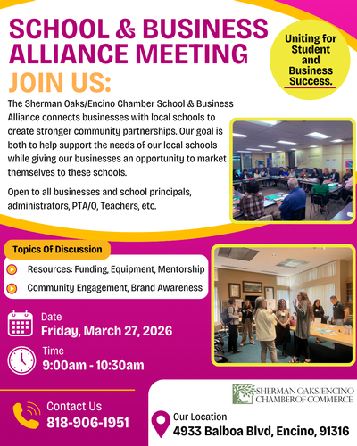 The Sherman Oaks/Encino Chamber School & Business Alliance connects businesses with local schools to create stronger community partnerships. Our goal is both to help support the needs of our local schools (through donations, teacher appreciation days, festivals, silent auctions) and at the same time give our businesses an opportunity to market themselves to local schools. This is intended to be a two-way street so both the schools and businesses benefit!